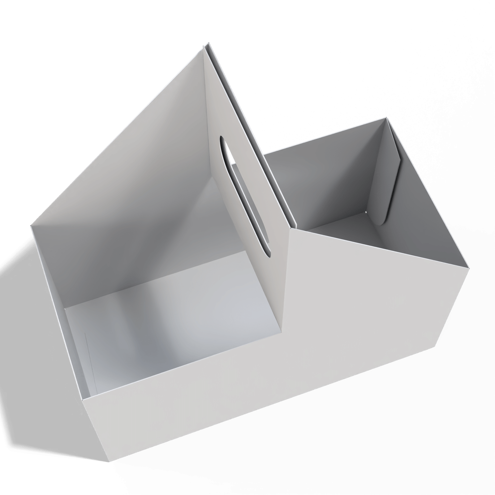 حامل أكواب ثنائي مصنوع من كرتون أبيض مقوّى بسماكة مرنة وفق الحاجة، مصمم لحمل كوبين بثبات أثناء التنقل.
