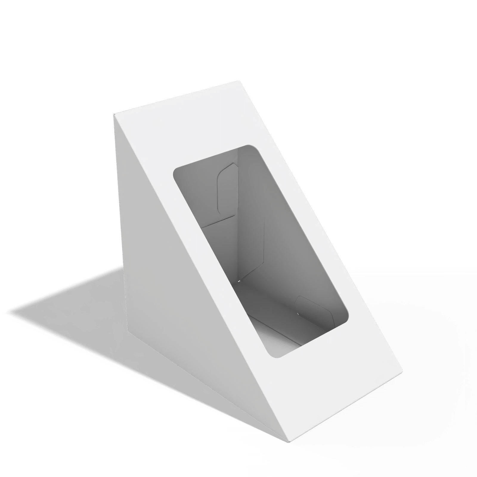 علبة سندويتش مثلثة مصنوعة من كرتون غذائي مقوّى بسماكة مرنة وفق الحاجة، مصممة لتقديم وحفظ السندويتشات الجاهزة بطريقة عملية وواضحة للعرض.