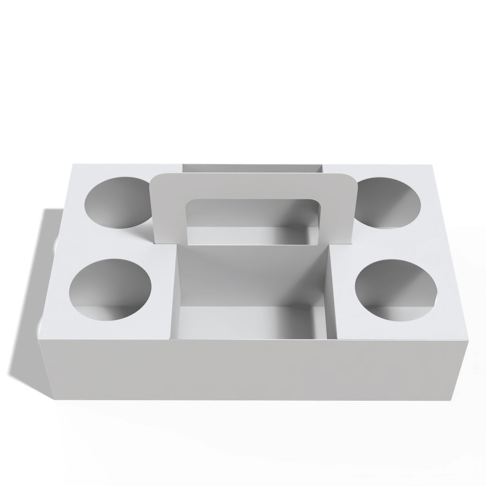 .حامل أكواب رباعي الشكل مزود بمقبض علوي لسهولة الحمل، مصنوع من كرتون ابيض.